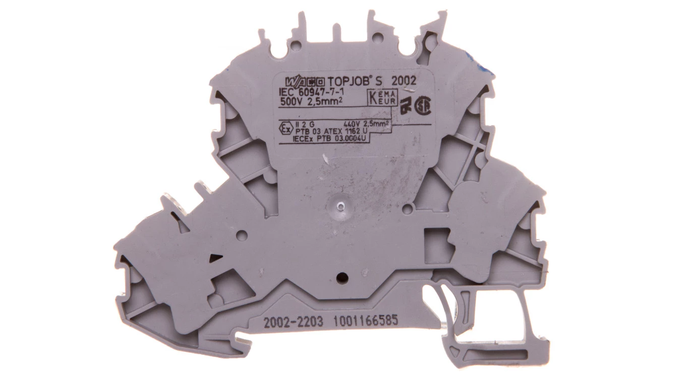 złączka 2-piętrowa; złączka przelotowa/przelotowa; L/N; bez podstawki oznacznika; do zastosowań Ex e II; otwory na przewody piętro, nadruk nieb.; na szynę TS 35 x 15 i 35 x 7,5; 2,5 mm²; Push-in CAGE CLAMP®; 2,50 mm²; szary