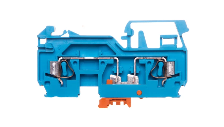 złączka rozłączalno-pomiarowa 2-przewodowa; z uchylnym łącznikiem nożowym; z otworem pomiarowym; uchwyt łącznika nożowego pomarańczowy; do zastosowań Ex i; na szynę TS 35 x 15 i 35 x 7,5; 2,5 mm²; CAGE CLAMP®; 2,50 mm²; niebieski