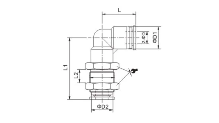 Złączka wtykowa grodziowa kątowa do węża fi 12, gwint nakrętki M22x1,tworzywo sztuczne/mosiądz niklowany, 152.012