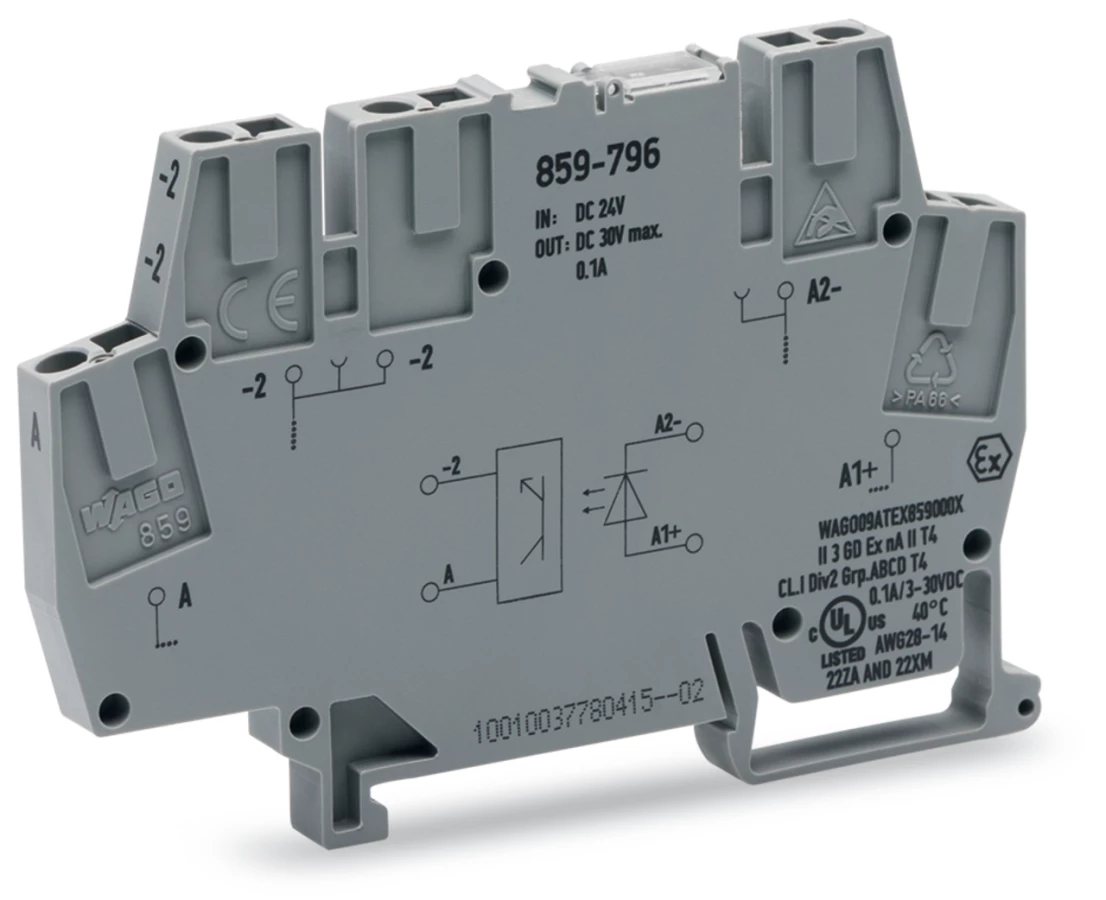 optoseparator; znamionowe napięcie wejściowe 24 V DC; zakres napięcia wyjściowego 3 … 30 V DC; maksymalny prąd długotrwały 0,1 A; podłączanie 2-przewodowe; kolejnictwo; częstotliwość 10 kHz; sygnalizacja statusu czerwony; szerokość 6 mm; szary