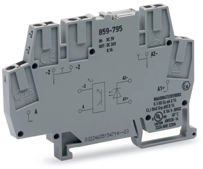 optoseparator; znamionowe napięcie wejściowe 5 V DC; zakres napięcia wyjściowego 3 … 30 V DC; maksymalny prąd długotrwały 0,1 A; podłączanie 2-przewodowe; kolejnictwo; częstotliwość 10 kHz; sygnalizacja statusu czerwony; szerokość 6 mm; szary
