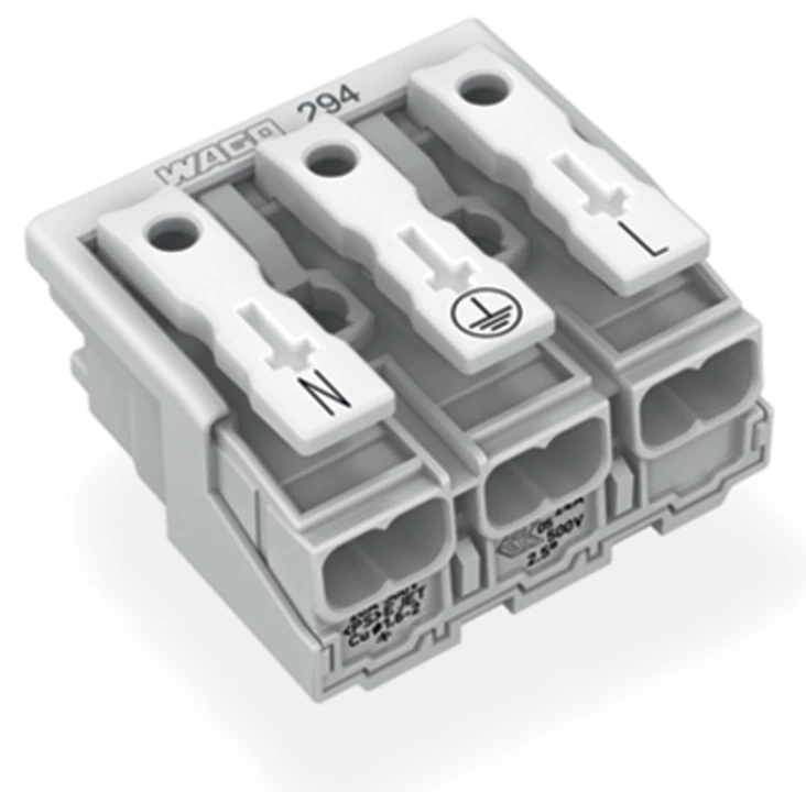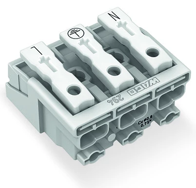 złączka zasilająca; przyciski: od strony zewn.; bez styku PE; N-PE-L; 3-bieg.; od strony oprawy: do przew. jednodr.; od strony inst.: do wsz. rodz. przewodów; maks. 2,5 mm²; temperatura otoczenia maks. 85°C (T85); biały