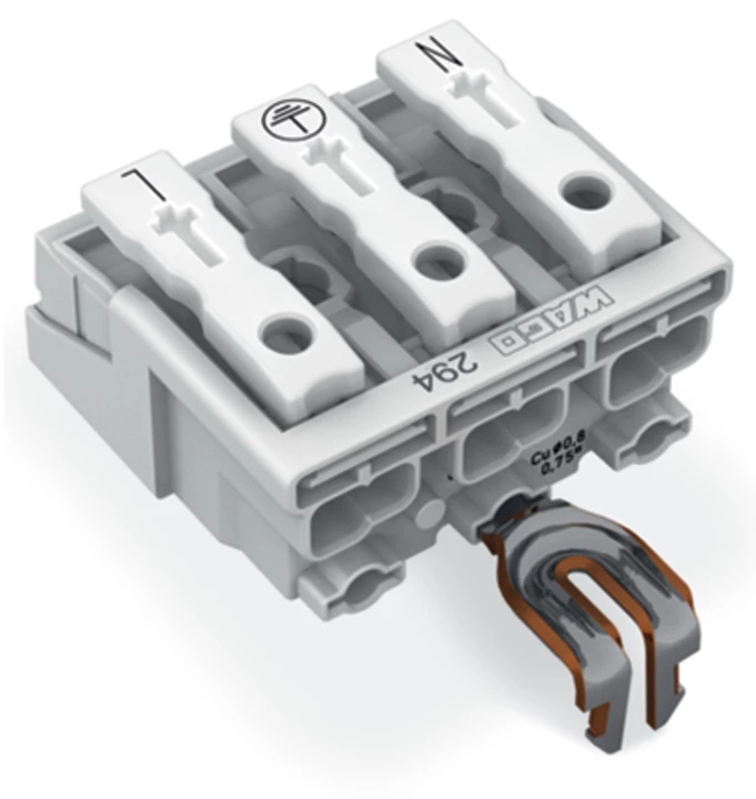 złączka zasilająca; przyciski: od strony zewn.; z zatrzaskowym stykiem PE; N-PE-L; 3-bieg.; od strony oprawy: do przew. jednodr.; od strony inst.: do wsz. rodz. przewodów; maks. 2,5 mm²; temperatura otoczenia maks. 85°C (T85); biały