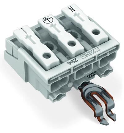 złączka zasilająca; przyciski: od strony zewn.; z kątowym stykiem zatrzaskowym PE; N-PE-L; 3-bieg.; od strony oprawy: do przew. jednodr.; od strony inst.: do wsz. rodz. przewodów; maks. 2,5 mm²; temperatura otoczenia maks. 85°C (T85); biały
