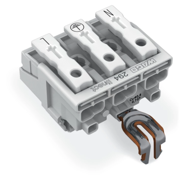 złączka zasilająca; przyciski: od strony zewn.; do Linect®; z zatrzaskowym stykiem PE; 3-bieg.; kodowanie A; od strony oprawy: do przew. jednodr.; od strony inst.: do wsz. rodz. przewodów; maks. 2,5 mm²; temperatura otoczenia maks. 85°C (T85); biały
