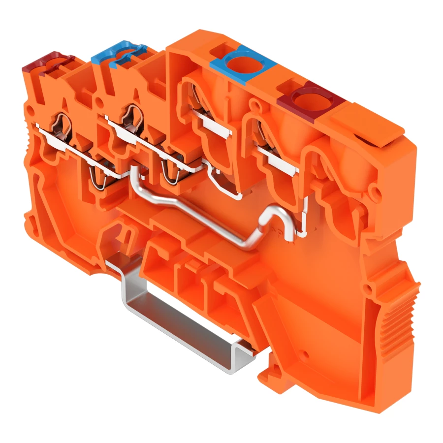 złączka zasilająca sygnałowa 3-piętrowa; zasilanie od strony szafy sterowniczej; z otworami na przew. z kolor. nadrukiem; 2,5 mm²; Push-in CAGE CLAMP®; 2,50 mm²; pomarańczowy