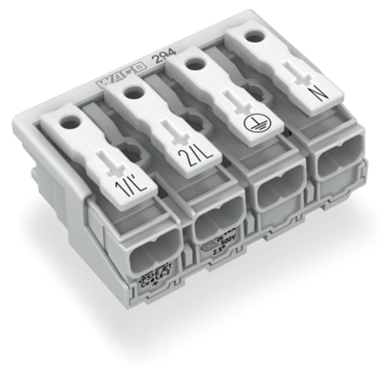 złączka zasilająca; przyciski: od strony zewn.; bez styku PE; 1/L-2/L-PE-N; 4-bieg.; od strony oprawy: do przew. jednodr.; od strony inst.: do wsz. rodz. przewodów; maks. 2,5 mm²; temperatura otoczenia maks. 85°C (T85); biały