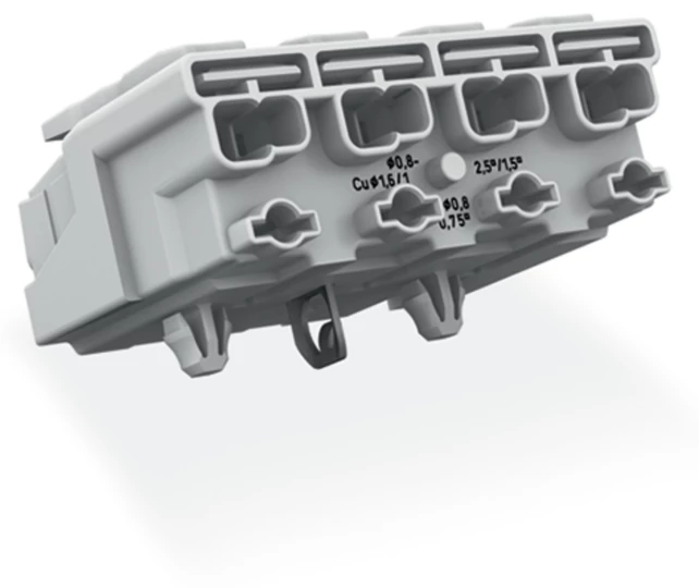 złączka zasilająca; przyciski: od strony zewn.; z bezpośrednim stykiem PE; 1/L-2/L-PE-N; 4-bieg.; od strony oprawy: do przew. jednodr.; od strony inst.: do wsz. rodz. przewodów; maks. 2,5 mm²; temperatura otoczenia maks. 85°C (T85); biały