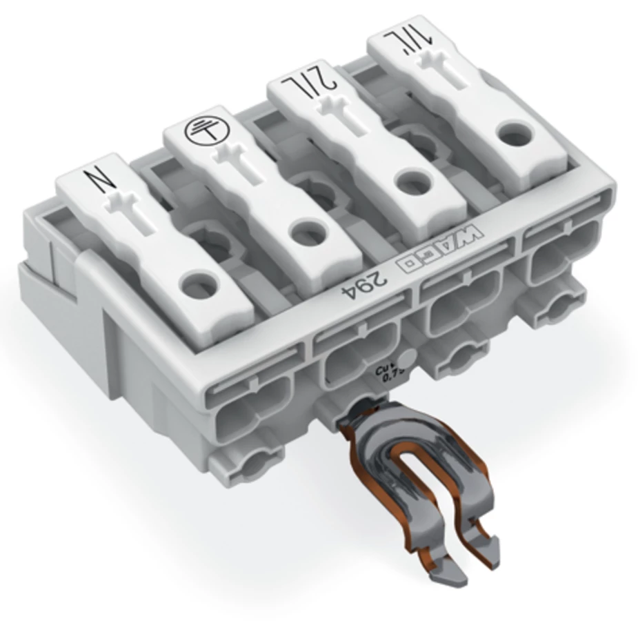 złączka zasilająca; przyciski: od strony zewn.; z kątowym stykiem zatrzaskowym PE; 1/L-2/L-PE-N; 4-bieg.; od strony oprawy: do przew. jednodr.; od strony inst.: do wsz. rodz. przewodów; maks. 2,5 mm²; temperatura otoczenia maks. 85°C (T85); biały