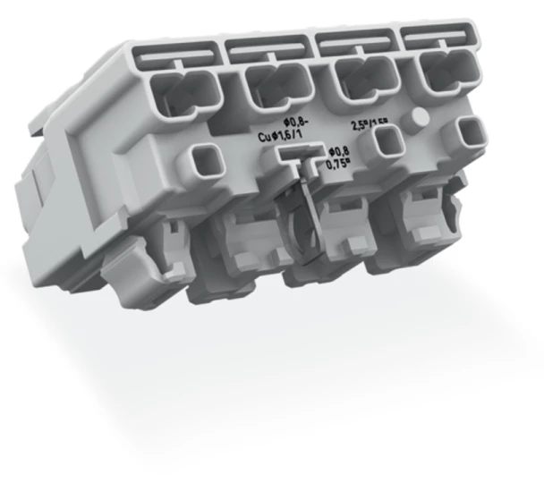 złączka zasilająca; przyciski: od strony zewn.; do Linect®; z bezpośrednim stykiem PE; 1/L-2/L-PE-N; 4-bieg.; kodowanie A; od strony oprawy: do przew. jednodr.; od strony inst.: do wsz. rodz. przewodów; maks. 2,5 mm²; temperatura otoczenia maks. 85°C (T85); biały