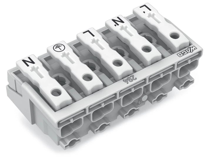 złączka zasilająca; przyciski: od strony zewn.; bez styku PE; L-N-L-PE-N; 5-bieg.; od strony oprawy: do przew. jednodr.; od strony inst.: do wsz. rodz. przewodów; maks. 2,5 mm²; temperatura otoczenia maks. 85°C (T85); biały