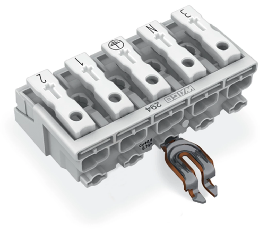 złączka zasilająca; przyciski: od strony zewn.; z zatrzaskowym stykiem PE; 5-bieg.; od strony oprawy: do przew. jednodr.; od strony inst.: do wsz. rodz. przewodów; maks. 2,5 mm²; temperatura otoczenia maks. 85°C (T85); biały