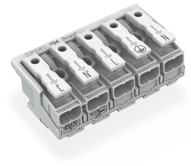 złączka zasilająca; przyciski: od strony zewn.; do Linect®; bez styku PE; L-N-L-PE-N; 5-bieg.; kodowanie L; od strony oprawy: do przew. jednodr.; od strony inst.: do wsz. rodz. przewodów; maks. 2,5 mm²; temperatura otoczenia maks. 85°C (T85); biały
