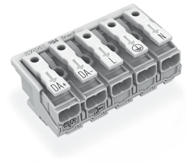 złączka zasilająca; przyciski: od strony zewn.; do Linect®; bez styku PE; DA+ DA- L PE N; 5-bieg.; kodowanie I; od strony oprawy: do przew. jednodr.; od strony inst.: do wsz. rodz. przewodów; maks. 2,5 mm²; temperatura otoczenia maks. 85°C (T85); biały