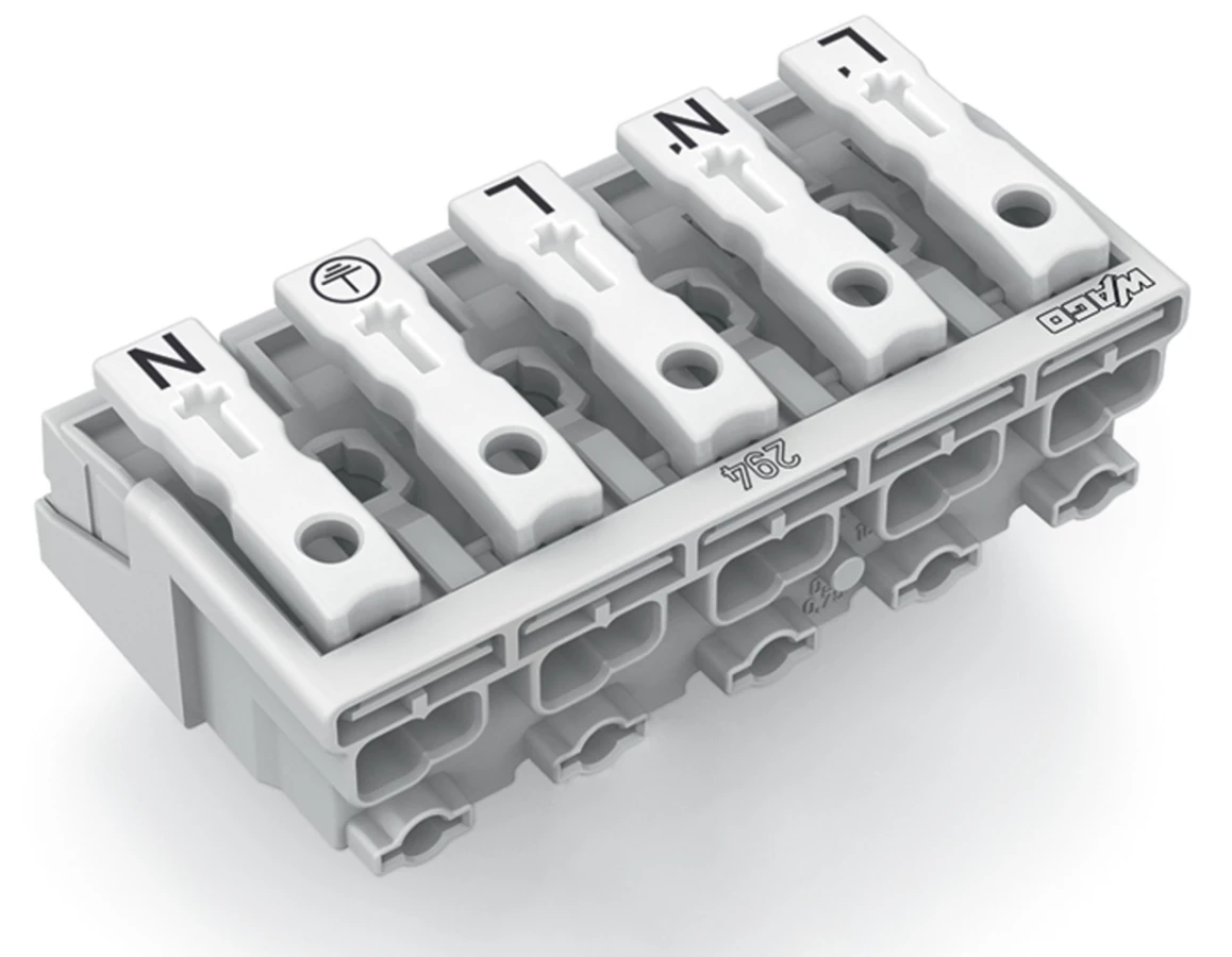 złączka zasilająca; przyciski: od strony zewn.; bez styku PE; L-N-L-PE-N; 5-bieg.; od strony oprawy: do przew. jednodr.; od strony inst.: do wsz. rodz. przewodów; maks. 2,5 mm²; temperatura otoczenia maks. 85°C (T85); biały