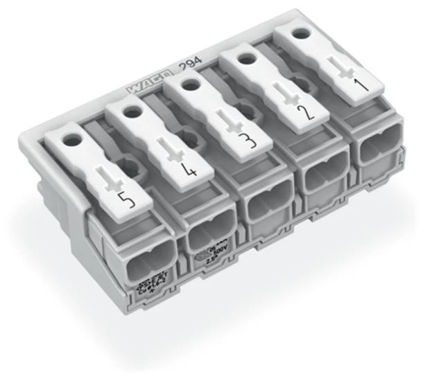 złączka zasilająca; przyciski: od strony zewn.; bez styku PE; 5-bieg.; od strony oprawy: do przew. jednodr.; od strony inst.: do wsz. rodz. przewodów; maks. 2,5 mm²; temperatura otoczenia maks. 85°C (T85); biały
