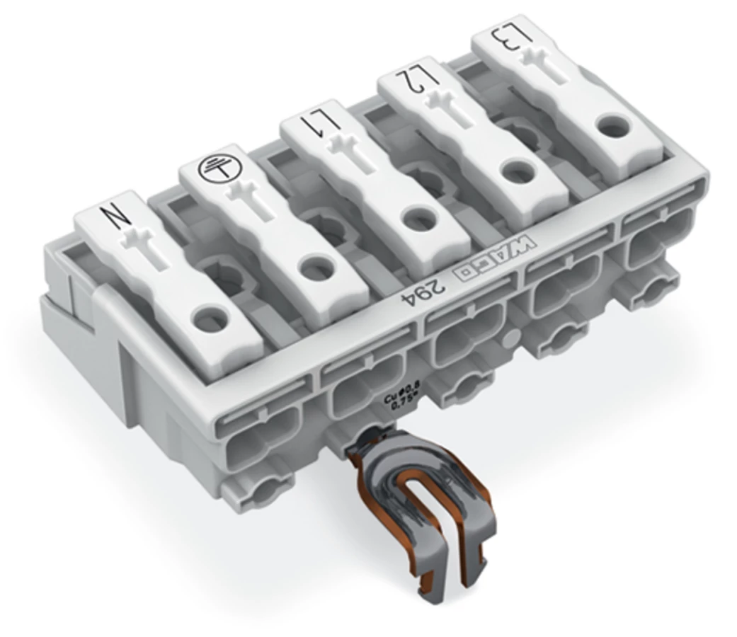 złączka zasilająca; przyciski: od strony zewn.; z zatrzaskowym stykiem PE; L3-L2-L1-PE-N; 5-bieg.; od strony oprawy: do przew. jednodr.; od strony inst.: do wsz. rodz. przewodów; maks. 2,5 mm²; temperatura otoczenia maks. 85°C (T85); biały