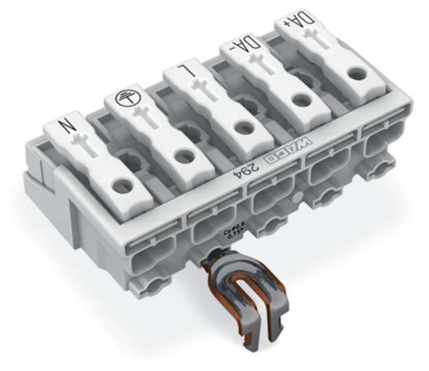 złączka zasilająca; przyciski: od strony zewn.; z zatrzaskowym stykiem PE; DA+ DA- L PE N; 5-bieg.; od strony oprawy: do przew. jednodr.; od strony inst.: do wsz. rodz. przewodów; maks. 2,5 mm²; temperatura otoczenia maks. 85°C (T85); biały