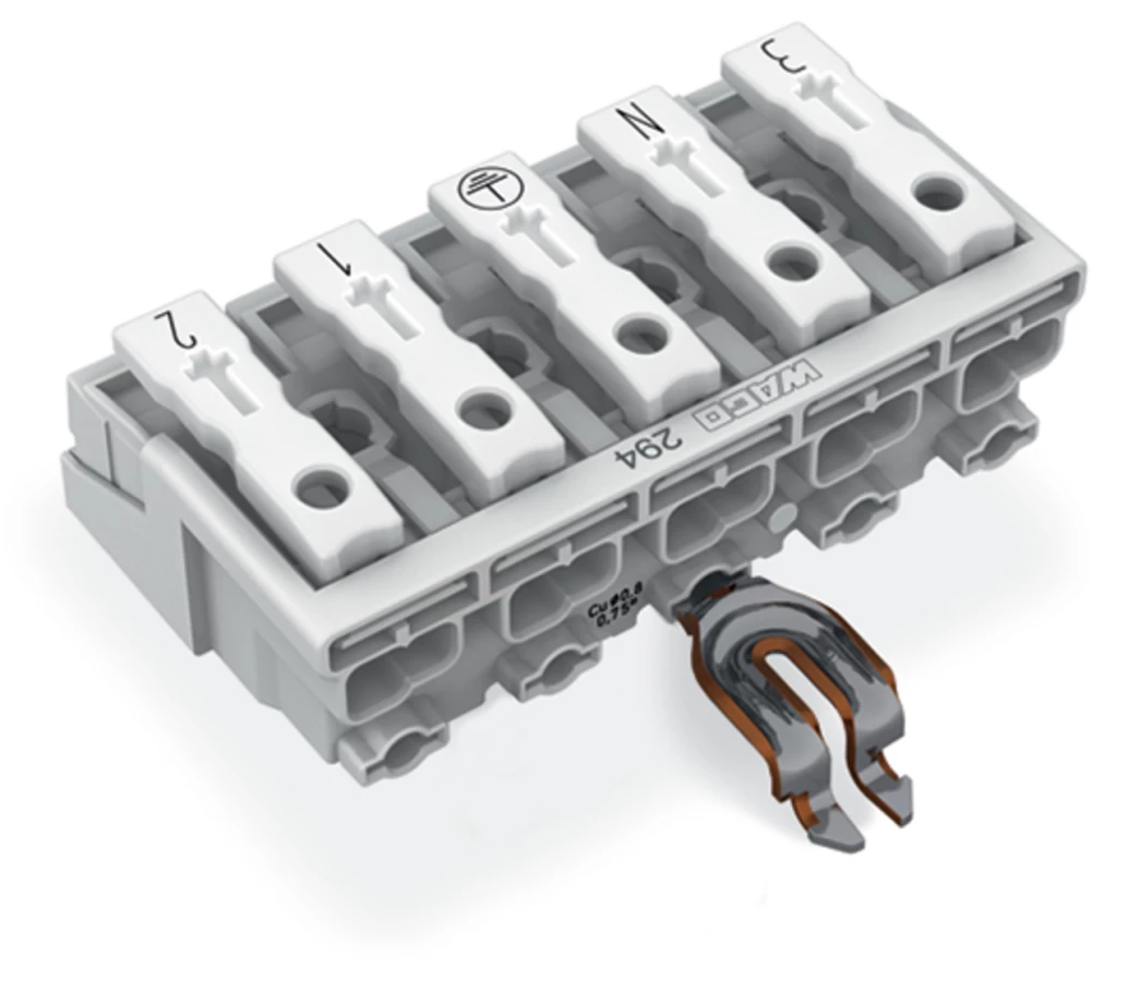 złączka zasilająca; przyciski: od strony zewn.; z kątowym stykiem zatrzaskowym PE; 5-bieg.; od strony oprawy: do przew. jednodr.; od strony inst.: do wsz. rodz. przewodów; maks. 2,5 mm²; temperatura otoczenia maks. 85°C (T85); biały