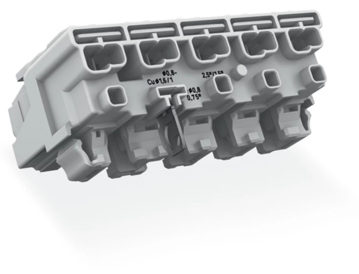 złączka zasilająca; przyciski: od strony zewn.; do Linect®; z bezpośrednim stykiem PE; L-N-L-PE-N; 5-bieg.; kodowanie L; od strony oprawy: do przew. jednodr.; od strony inst.: do wsz. rodz. przewodów; maks. 2,5 mm²; temperatura otoczenia maks. 85°C (T85); biały