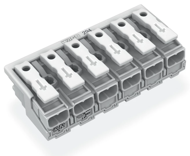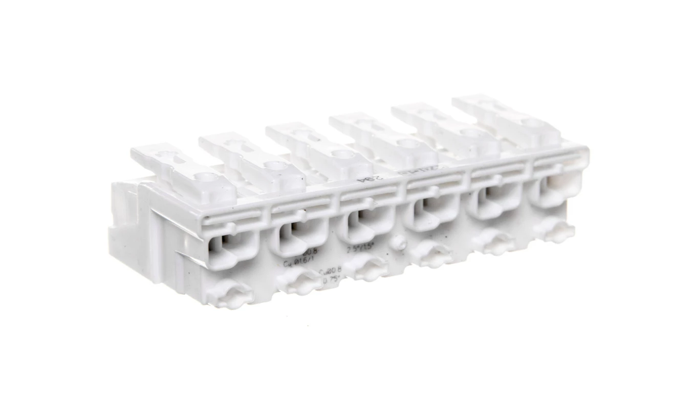 złączka zasilająca; przyciski: od strony zewn.; bez styku PE; 6-bieg.; od strony oprawy: do przew. jednodr.; od strony inst.: do wsz. rodz. przewodów; maks. 2,5 mm²; temperatura otoczenia maks. 85°C (T85); biały
