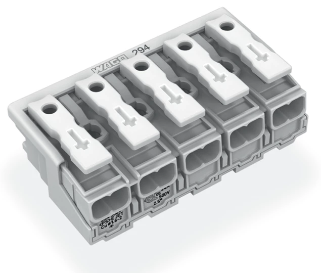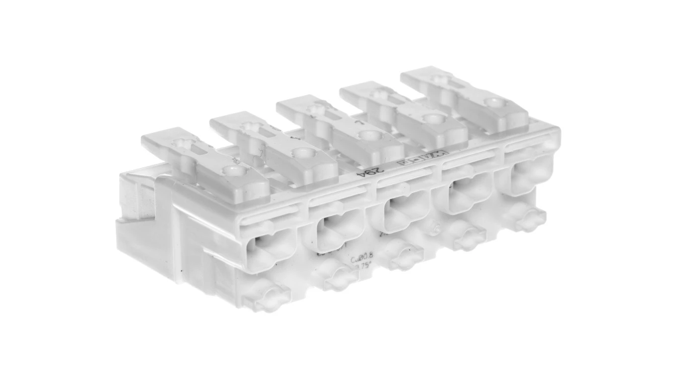 złączka zasilająca; przyciski: od strony zewn.; bez styku PE; 5-bieg.; od strony oprawy: do przew. jednodr.; od strony inst.: do wsz. rodz. przewodów; maks. 2,5 mm²; temperatura otoczenia maks. 85°C (T85); biały