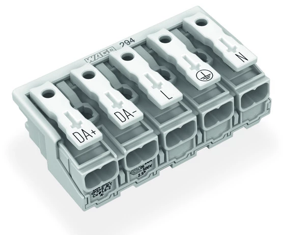 złączka zasilająca; przyciski: od strony zewn.; bez styku PE; DA+ DA- L PE N; 5-bieg.; od strony oprawy: do przew. jednodr.; od strony inst.: do wsz. rodz. przewodów; maks. 2,5 mm²; temperatura otoczenia maks. 85°C (T85); biały