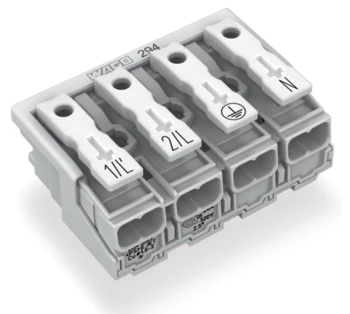 złączka zasilająca; przyciski: od strony zewn.; bez styku PE; 1/L-2/L-PE-N; 4-bieg.; od strony oprawy: do przew. jednodr.; od strony inst.: do wsz. rodz. przewodów; maks. 2,5 mm²; temperatura otoczenia maks. 85°C (T85); biały