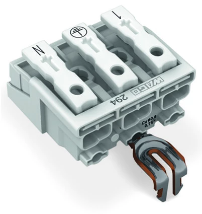 złączka zasilająca; przyciski: od strony zewn.; z zatrzaskowym stykiem PE; 3-bieg.; od strony oprawy: do przew. jednodr.; od strony inst.: do wsz. rodz. przewodów; maks. 2,5 mm²; temperatura otoczenia maks. 85°C (T85); biały