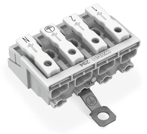 złączka zasilająca; przyciski: od strony zewn.; ze śrubowym stykiem PE; 4-bieg.; od strony oprawy: do przew. jednodr.; od strony inst.: do wsz. rodz. przewodów; maks. 2,5 mm²; temperatura otoczenia maks. 85°C (T85); biały