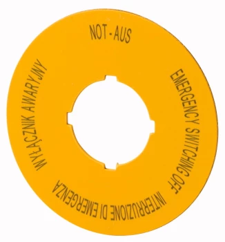 M22-XBK5 TABLICZKA OPISOWA OKRĄGŁA F60 "WYŁACZNIK AWARYJNY" PL/ IT/ EN/ DE ŻÓŁTY